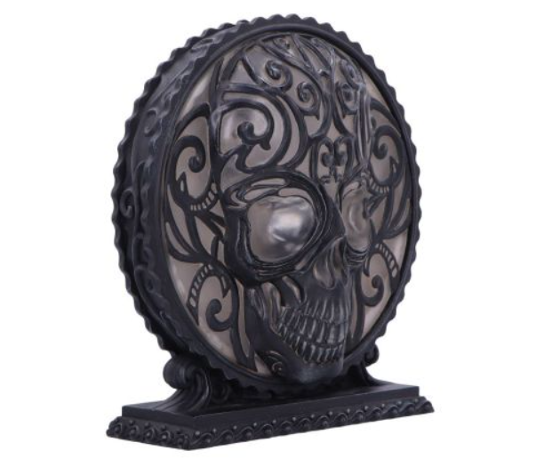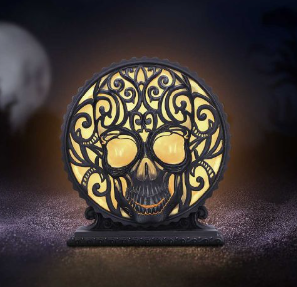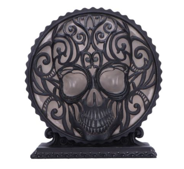 The lamp features a detailed resin sculpture with a soft ambient glow. The centrepiece skull is made up of intricate patterns on a sturdy base.